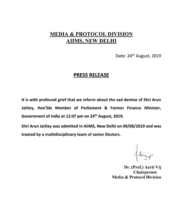 Jaitley was rushed to the All India Institute of Medical Sciences (AIIMS) in New Delhi on 9 August after he complained of breathlessness and restlessness. Since then he was on extracorporeal membrane oxygenation (ECMO) and intra-aortic balloon pump (IABP) support.