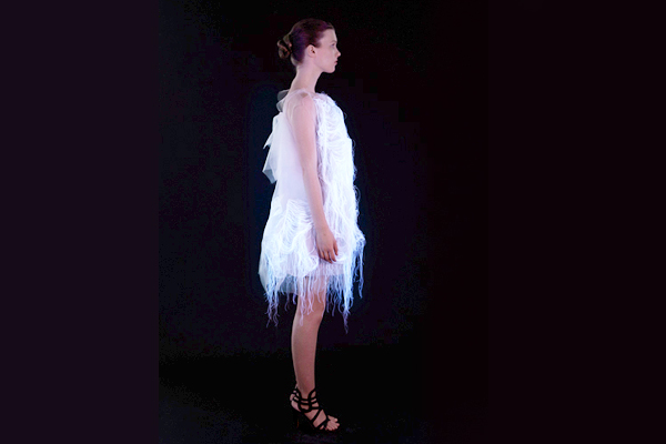 These loose white and ivory shift dresses boast of tiny eye-tracking electronic devices and small motors that gets activated when looked at. The hi-tech sensory technology transforms the pale, sheer dresses into luminescent “wonders” at every gaze.
