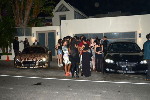 Justin walked in at the party, dressed in classic letterman varsity jacket and holding a rose in his hand, just after midnight. He drove in in his classic leopard print car with buddy Jaden Smith. Though he was with a group of guy friends, Justin soon made his way to meet Selena.
