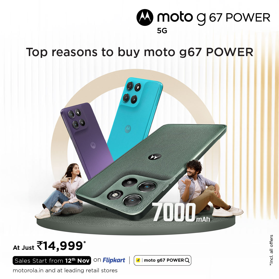 Moto G67 Power 5G, which will be the newest addition to the company's G series, is set to launch in India on Wednesday. A microsite on Flipkart recently confirmed that the phone will be available on that online platform and showcased its main features. Now, the Moto G67 Power 5G has appeared on the company's website in India, sharing details about its storage options, colors, and hardware specifications. The Moto G67 Power 5G will run on a Snapdragon 7 series processor and include a large 7,000mAh battery. The phone will come in two different storage options and three color choices. The Moto G67 Power 5G has now been listed on the Motorola India website. The new listing shows that the device will be available in India with 8GB RAM and either 128GB or 256GB of storage. It will come in three colors selected from Pantone: Parachute Purple, Blue Curacao, and Cilantro.
