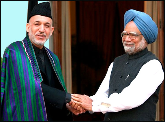 Prime Minister Manmohan Singh along with  Afghan President Hamid Karzai